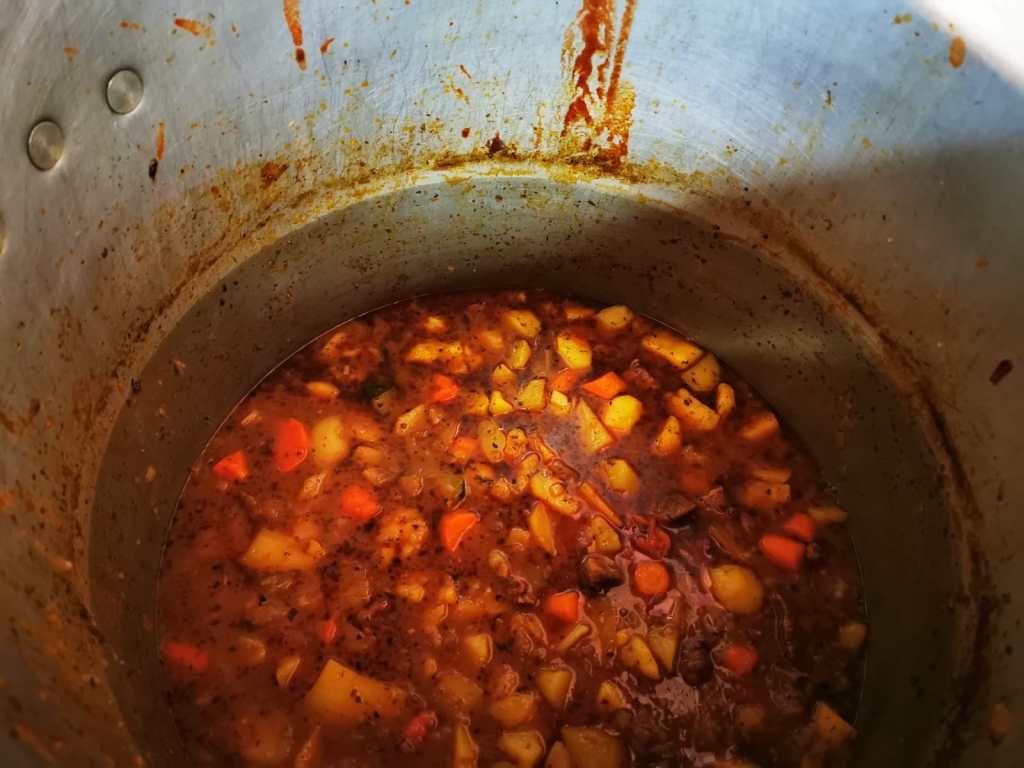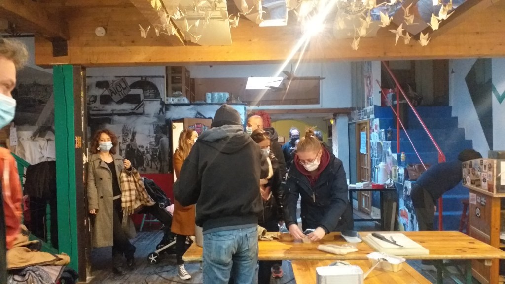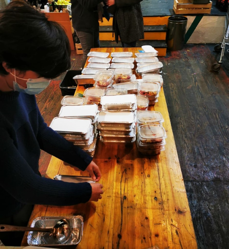 A tak brzo vznikne nápad spolupráce a solidárního guláše, který se navíc spojí s vášní naší Anne-Claire pro Mikuláše, a je tu mikulášskej zavěšenej guláš. Za pár dní. Rychle zakládáme online sbírku a hledáme místo. Naštěstí narazíme na neuvěřitelnýho šéfkuchaře Josého a Dar Lamifu, kde se během karantény zorganizovala autonomní dobrovolná síť studentů a dalších lidí, co, když maj zrovna čas, tak přijdou nakrájet pár brambor nebo mrkví, a každej den připravujou a roznáší jídlo lidem na ulici.